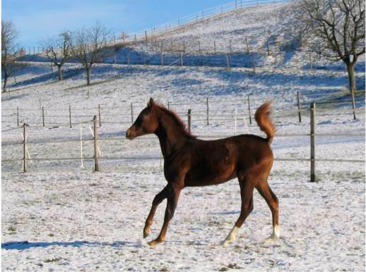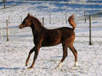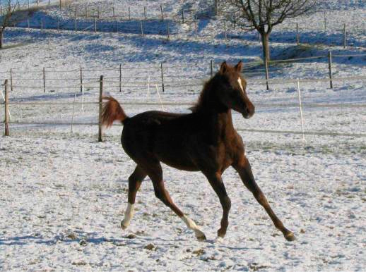 Ein bezauberndes, typvolles Hengstchen, das sich stolz wie ein Pfau zu präsentieren weiss. Mit federnden, kadenzierten Trabschritten, das Schweifchen frech über den Rücken gelegt, den Hals selbstbewusst gebogen, scheint er das Imponiergehabe von seinem Papi Bajkal auf der Weide abgeschaut zu haben. Baheer ist absolut unerschrocken und cool, eine kleine Persönlichkeit mit grosser Ausstrahlung. Er geniesst es sehr, Mittelpunkt inmitten eines möglichst zahlreichen Publikums zu sein! Dabei ist er sehr korrekt, mit schöner Oberlinie, eleganter Halsung und einem typvollen Gesicht mit feiner Nüsternpartie. Dazu kommt eine schicke Dunkelfuchsfarbe. Baheer wurde an der Beständeschau 2003 goldprämiert!