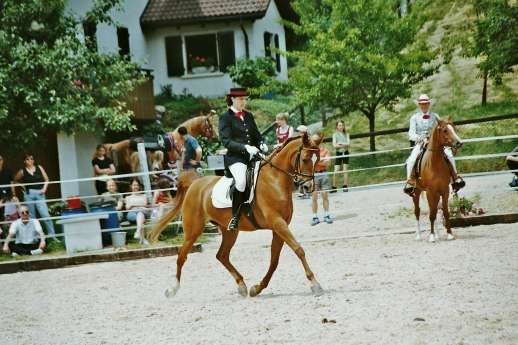 Nach einer verletzungsbedingten "Babypause", wo sie uns drei sehr schöne Hengstfohlen (siehe unten *) brachte, wurde sie 2009 und 2010 von Aline Weber wiederum an Dressurturnieren vorgestellt; 2009 erlangte sie in der Jahreswertung Dressur den ausgezeichneten 3. Rang und 2010 den 6. Rang. Obwohl noch kerngesund und fit, haben wir sie seit 2011 aus dem aktiven Turniersport zurückgezogen. Seither wird sie nach wie vor regelmässig im Gelände geritten, wo sie auch mit 20 Jahren immer noch einen beachtlichen Ehrgeiz an den Tag legt.