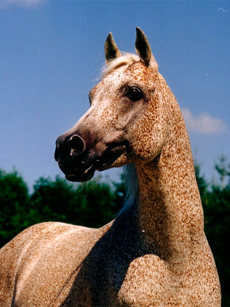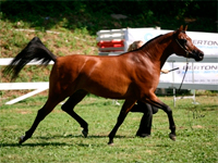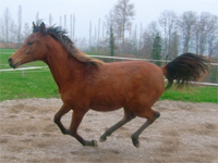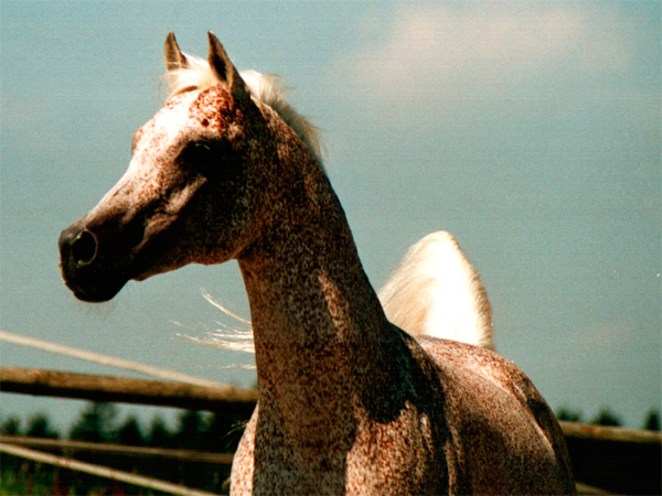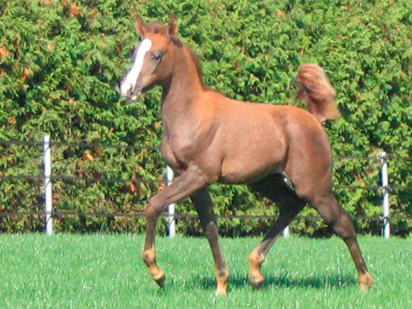 Ghanim ist ein ganz besonderes Pferd, in vielerlei Hinsicht! Dieser attraktive Jüngling mit dem klassischem, arabischen Überguss und dem coolen, anständigen Charakter ist eines der ganz wenigen, in den letzten Jahren geborenen Kinder des berühmten, kürzlich verstorbenen Europa- und Multichampions Gips (Mashuk x Polinezia) und sein letztgeborener Nachkomme in der Schweiz überhaupt. Genau so unkompliziert und problemlos wie Ghanim auf die Welt gekommen ist (er war eines Morgens zu aller Überraschung einfach "da" und probte in der Boxe bereits die ersten Runden im flotten Tempo), so ist er auch heute noch. Tierarzt und Hufschmied werden mit Bestimmtheit nicht reich an ihm, er hat eine robuste, zähe Konstitution, seine Hufe sind von harter, ausgezeichneter Qualität, sein gut gebauter Körper steht auf einem aussergewöhnlich korrekten Fundament. Er stammt aus russischen Top-Leistungslinien, seine Mama Keshma (Kosmonaut x Rishah) lief während mehrerer Jahre erfolgreich im Dressursport, die Nachkommen von Gips haben viele Top-Plazierungen in verschiedenen Sport- und Schaudisziplinen (z.B. Ra'is/Endurance, Sharif/Dressur, Nil Nouza/Schauen u.v.m.) aufzuweisen. Kommentar über Ghanim von Deirdre Hyde, Zuchtleiterin von Sheikh Sultan bin Zayed al Nahyan (Abu Dhabi) und hochgeachtete int. Richterin: You must be really very pleased with him!